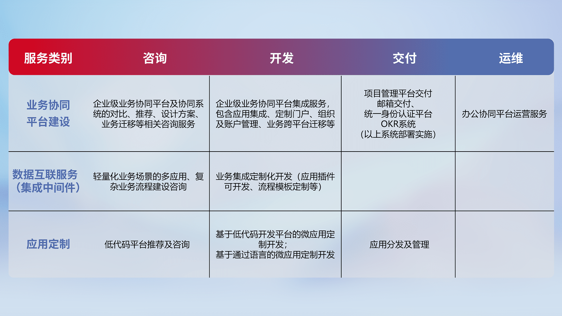 针对钉钉、、、企微、、、、IDaas等平台级产品提供产品的规划、、、方案、、、交付、、定制化开发等服务,,,实现如统一协同办公、、、、智能客户服务、、、混合会议管理、、、智能数据查询、、、等业务场景,,,实现数字化转型。。。