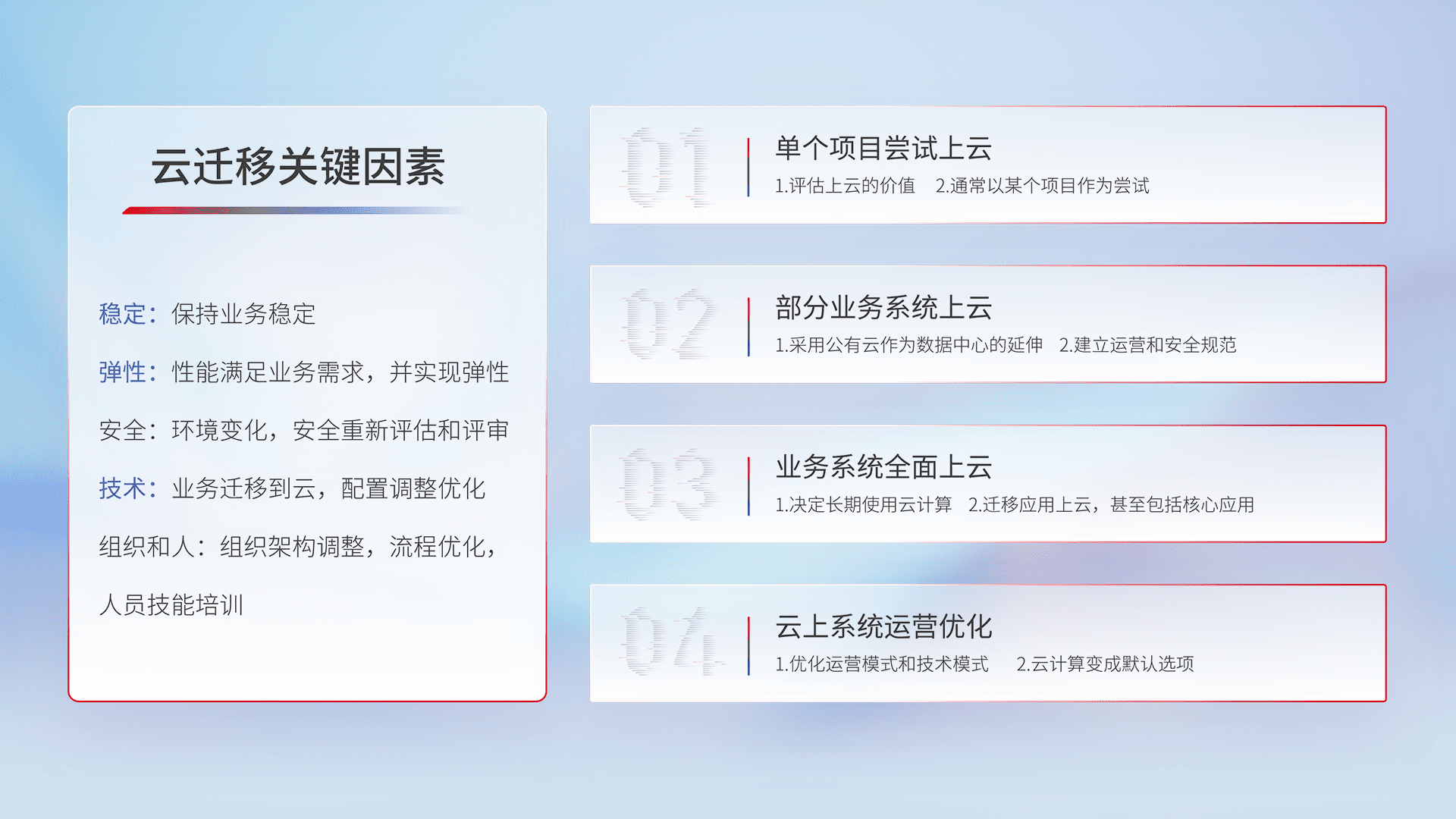 结合实际业务,,,从规划设计、、、、云平台选型、、云原生改造、、数据迁移、、集成交付,,迁移全过程为客户识别最佳上云路径,,,,做好风险识别管理,,,,设计网络架构、、、、身份权限、、安全审计合规、、、操作审计、、、、日志审计、、、、监控告警策略、、多站点容灾设计等,,对云上基础设施进行整体规划,,,,提升IT治理水平,,以满足弹性、、、、高可用、、、、高性能的需求。。。