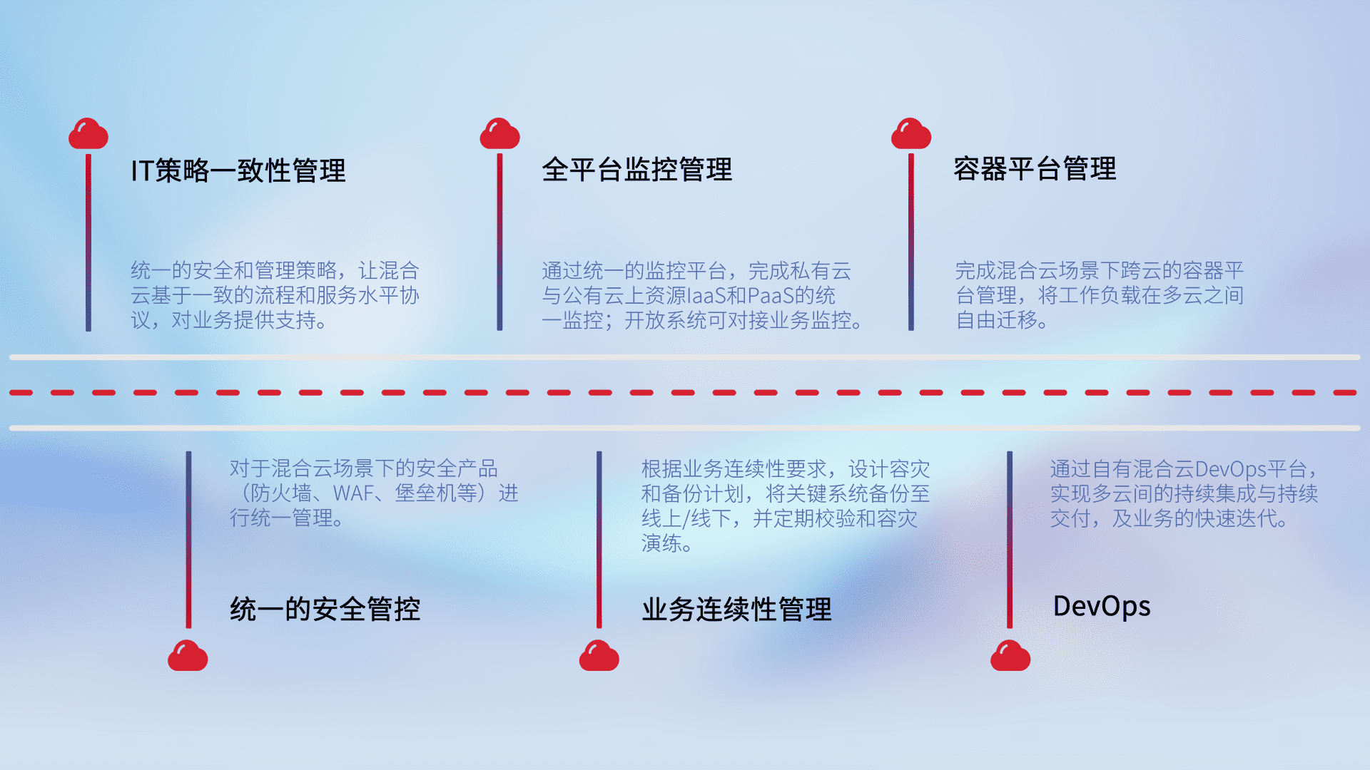 通过多云纳管,,,,以统一的资源数据模型把客户的云资源进行抽象和封装,,,进而实现对多云资源的统一操作,,,,保障云资源管理的可靠性、、、、稳定性与可用性。。量身定制化运维内容,,配置、、、开发运维、、、、补丁管理、、备份、、、监控、、认证和访问管理、、、、审计和日常巡检等,,保障在用云过程中的可靠度,,,,稳定度以及高可用率。。。