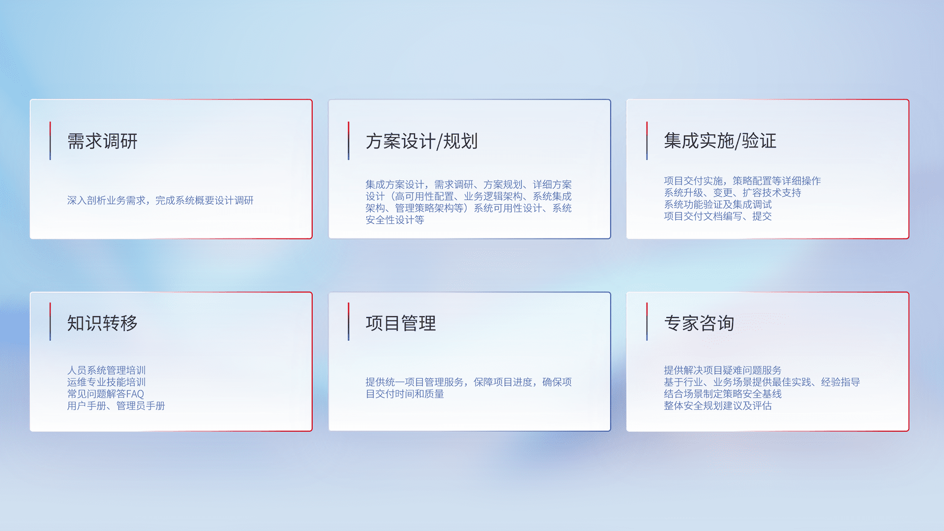 针对客户行业特性,,,将宏观的安全战略和需求,,,,通过专业的交付服务,,,,实现项目落地,,为客户提供标准规范的集成交付服务。。。